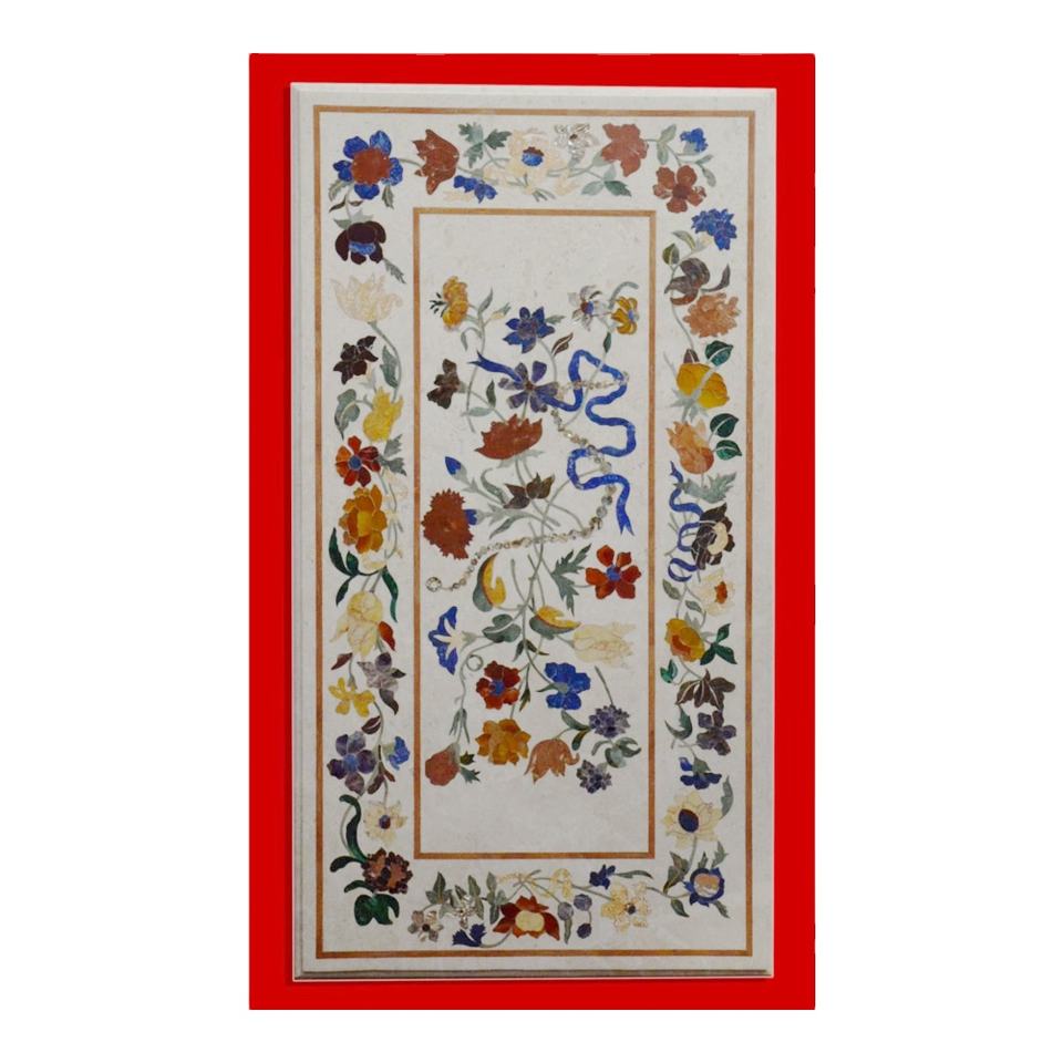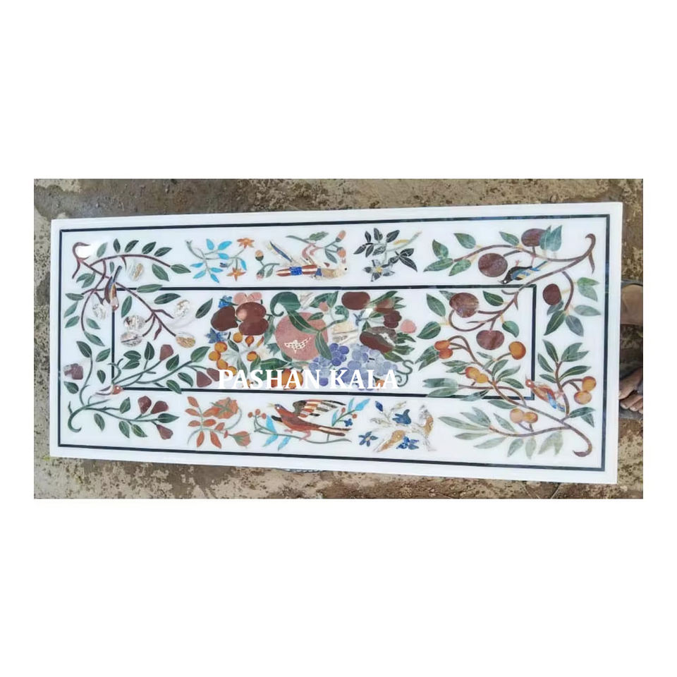Plateau de table rectangulaire en marbre blanc indien de qualité supérieure, fait main, avec incrustations florales, idéal pour les cadeaux d'affaires