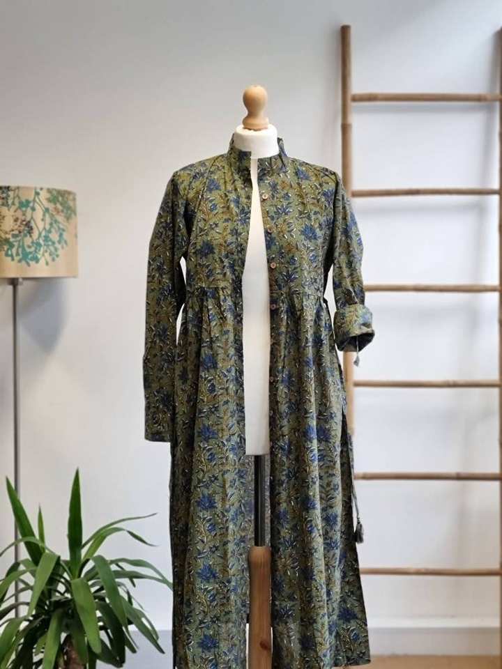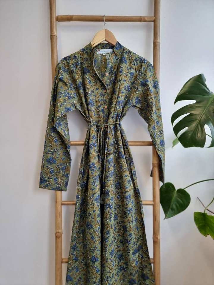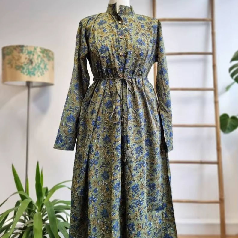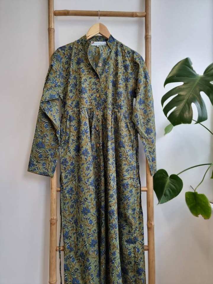 Indian Block Print Green Floral Midi Dress Pure Cotton Summer Daywear Elegant Comfy Front Button Down Casual Beach Mommy Dress