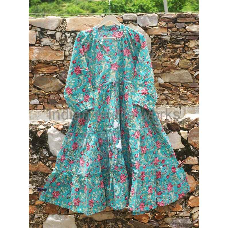 Robe en coton indien à imprimé en blocs, col en V, boutons, mi-longue, style bohème, manches bouffantes