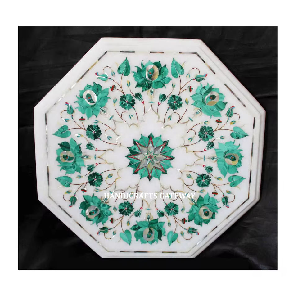 Designer indien fait à la main blanc marbre vert incrustation florale dessus de table forme octogonale utilisation pour la décoration de la maison et du restaurant