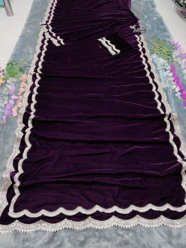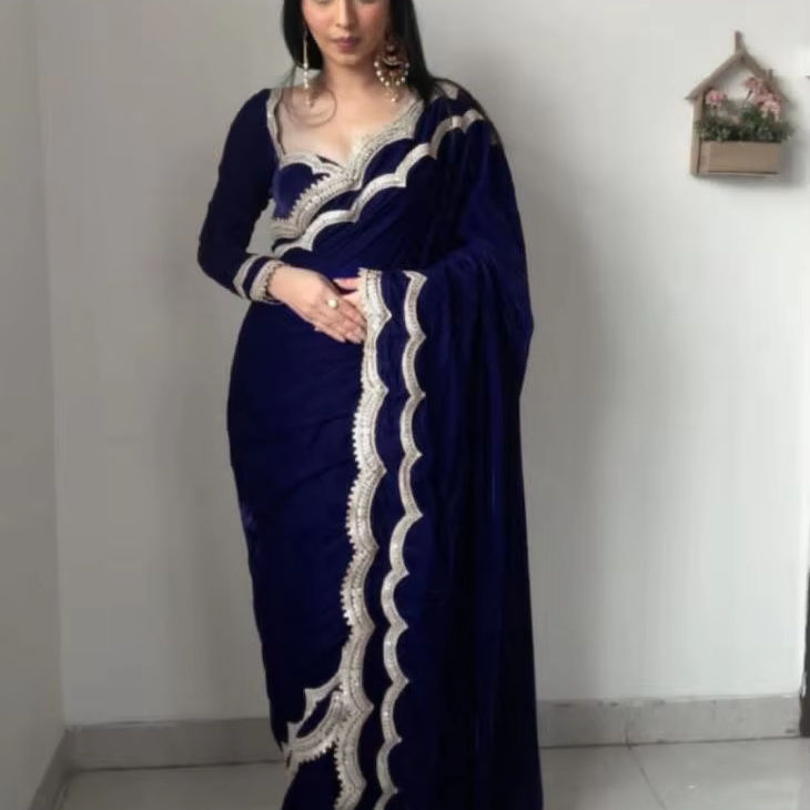 Antra Lifestyle Sari en velours traditionnel indien de créateur, prêt-à-porter, avec sequins, pour l'hiver, l'été, les fêtes et les mariages, infroissable