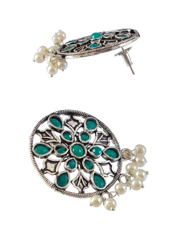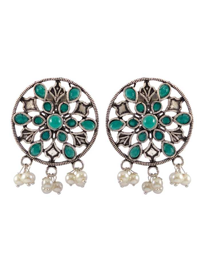 Product Name:Oxidised Silver Floral Green Kundan & White Pearl Round Earrings
