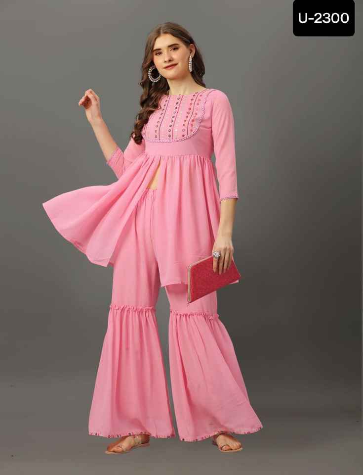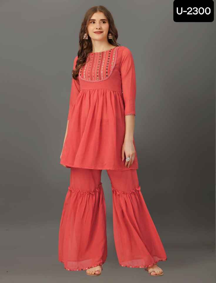 Vêtements ethniques indiens Georegtte avec motif de cou de travail miroir et Georgette Sharara avec belle dentelle Kurtis pour les femmes portent un costume
