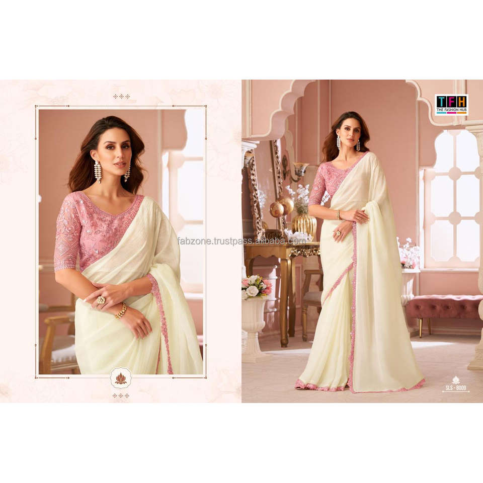 Fantaisie indienne avec séquence de couleurs doubles et broderie de fil Saree à bordure coupée avec chemisier en soie Satin Banglory