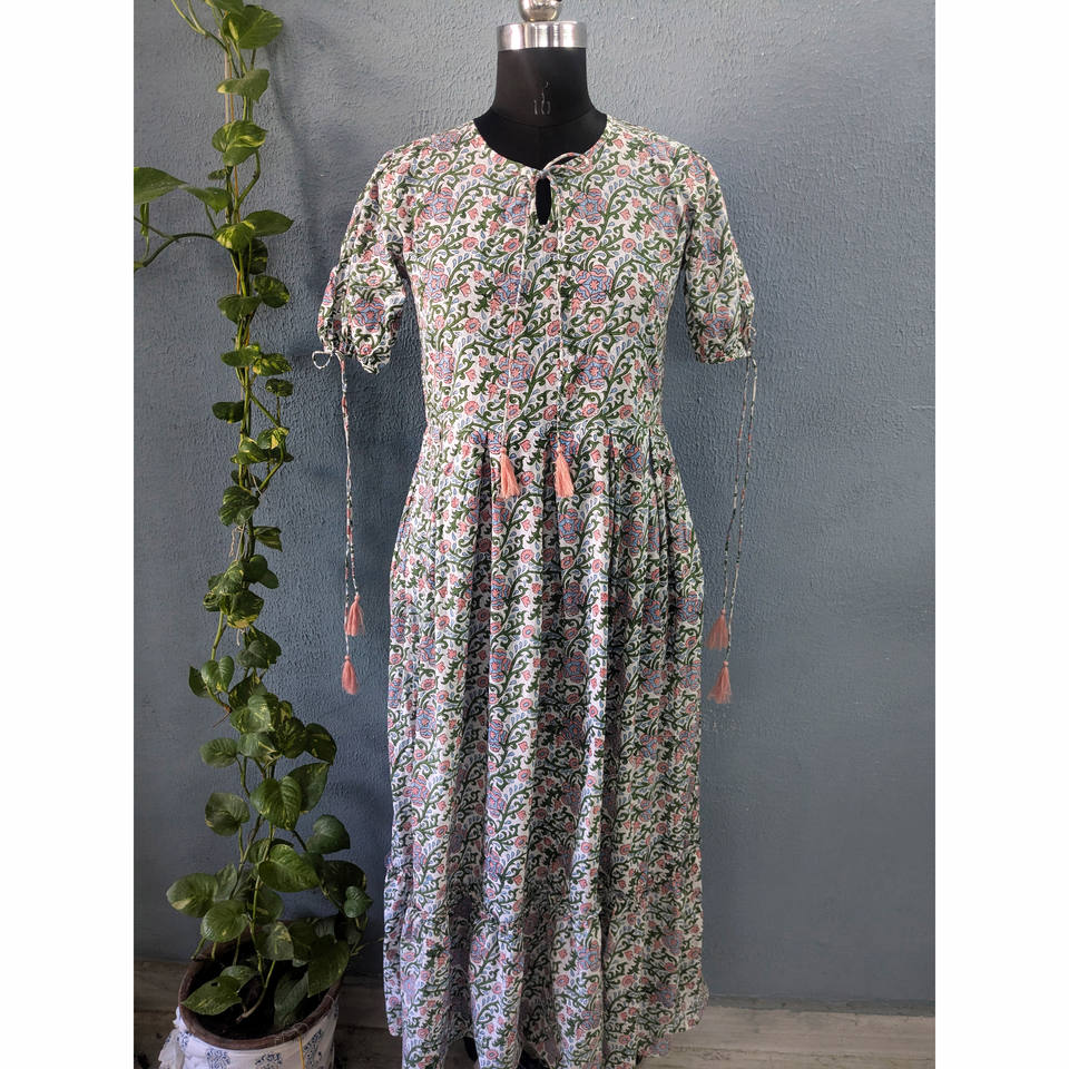 Indien main bloc imprimé écologique Voile coton robe d'été pour les femmes élégant motif floral naturel doux gland robe