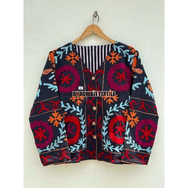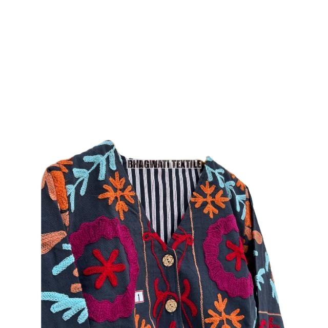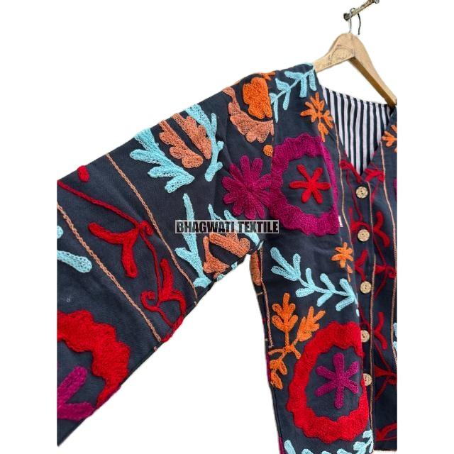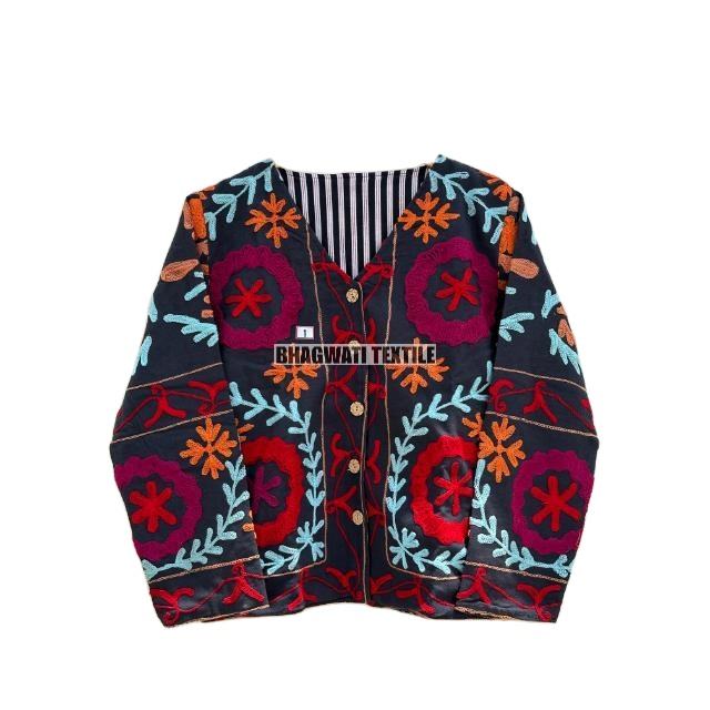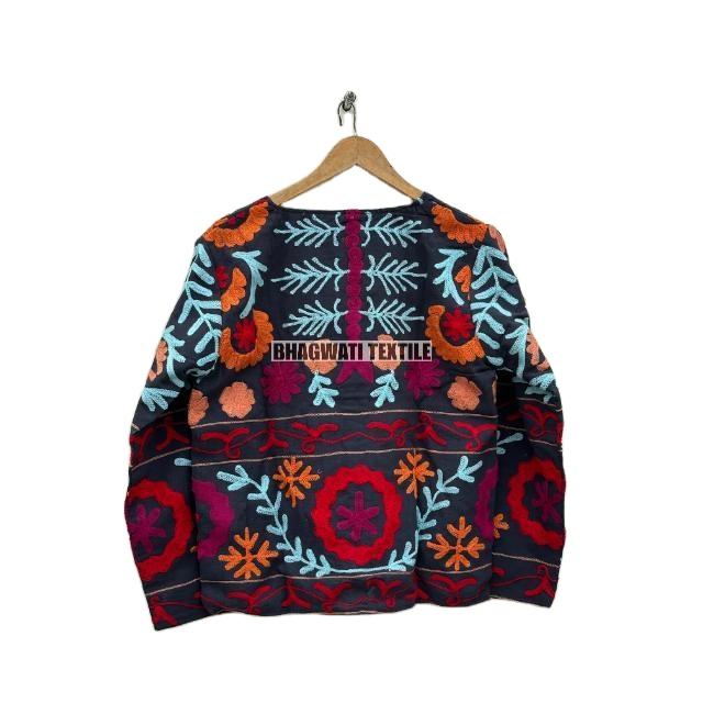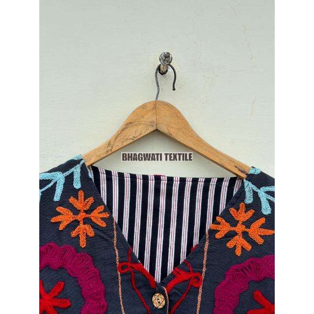 Veste en coton respirant brodée à la main style Suzani indien pour femme, collection Printemps Bohème Boho Gypsy Crewel Festival, bords bruts