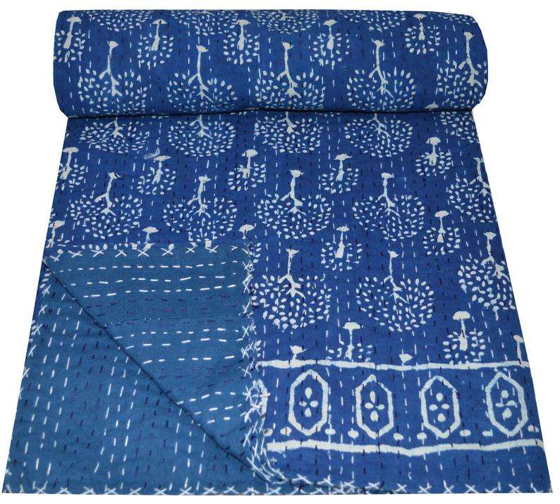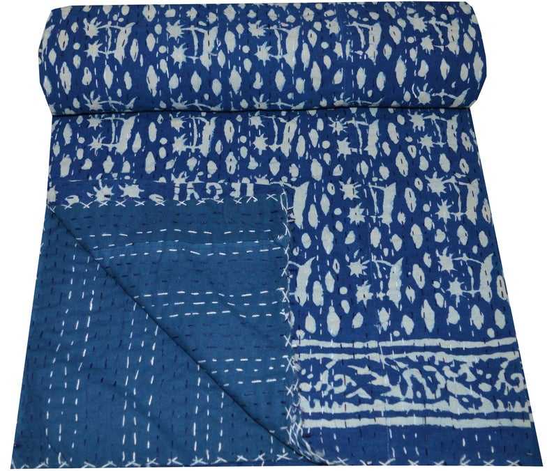 Couverture de jet de couette Kantha 100% coton imprimé bloc de main indigo bleu fait à la main indien