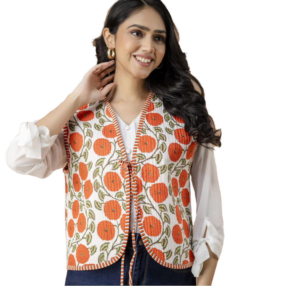 Bloc de coton indien fait à la main imprimé fleuri réversible femmes ouvert avant gilet veste Streetwear String plus proche gratuit