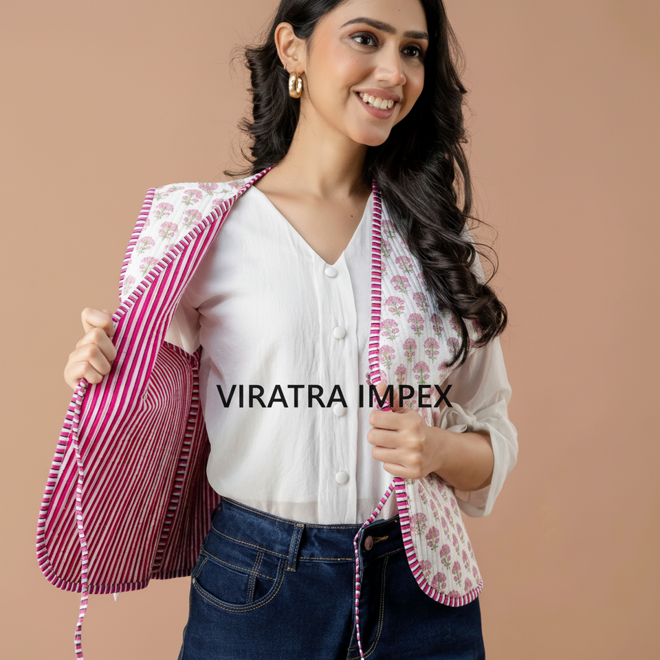 Indian Handmade Cotton Block Floral Printed Reversible Striped Open Front String Closer Waistcoat for Women
