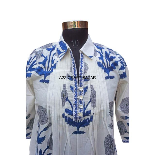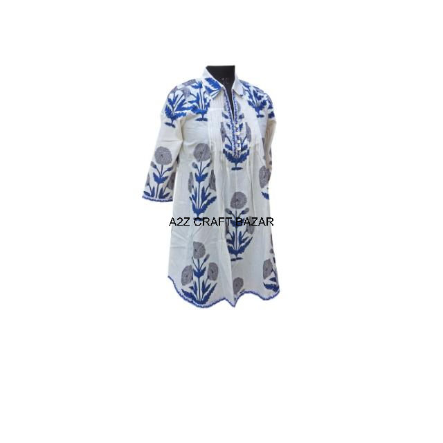 Indien fait à la main coton Mini a-ligne tunique robe femmes confortable léger lavable bouton à manches courtes col en v profond main bloc