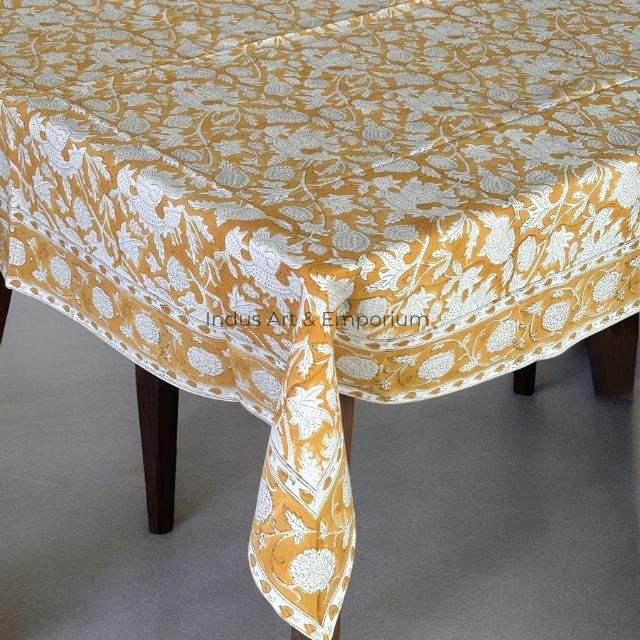 Indian Handmade Cotton Yellow Table Cloth Beautiful Hand Block Printed Cotton Table Cover for Wedding Table Cloth for Sale