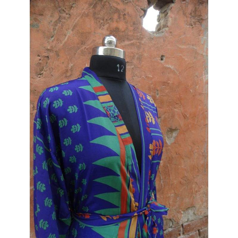 Robe de nuit Maxi Kimono à imprimé Floral fait à la main, vêtements de nuit scintillants, couleur bleue, Vintage, en soie, Style indien, longueur aux genoux,