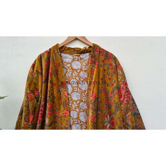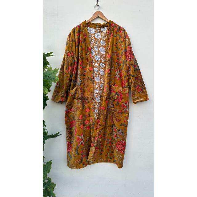Indien fait à la main manches longues réversible coton velours Floral Kimono Robe femmes grande taille Robe vêtements de nuit