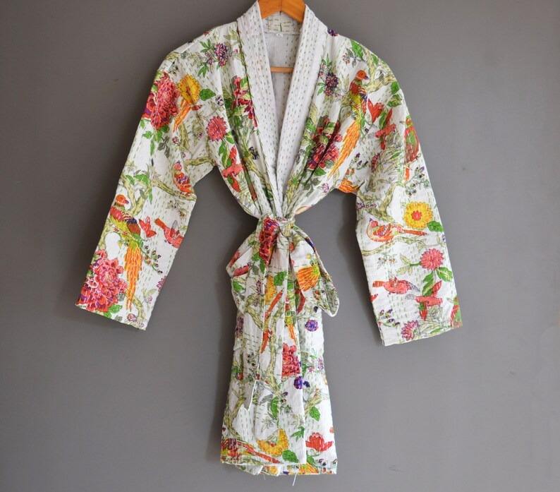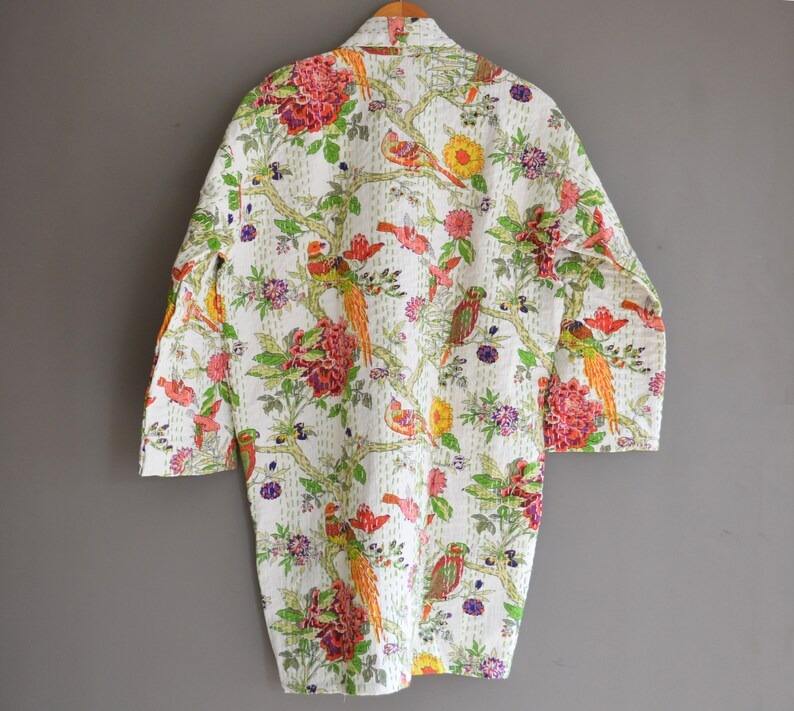 Veste Kantha indienne faite à la main pour femmes avant conception ouverte fleur bloc impression couette faisant inspiré lettre fête porter pour les hommes