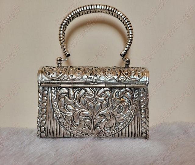 Indian Handmade Silver Metal High Grade Brass Handbags for Women Fashion Silver Plated Handicraft Clutch