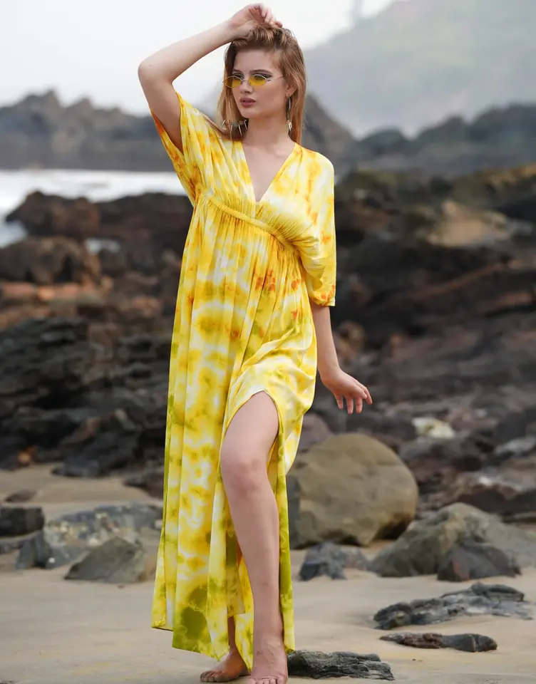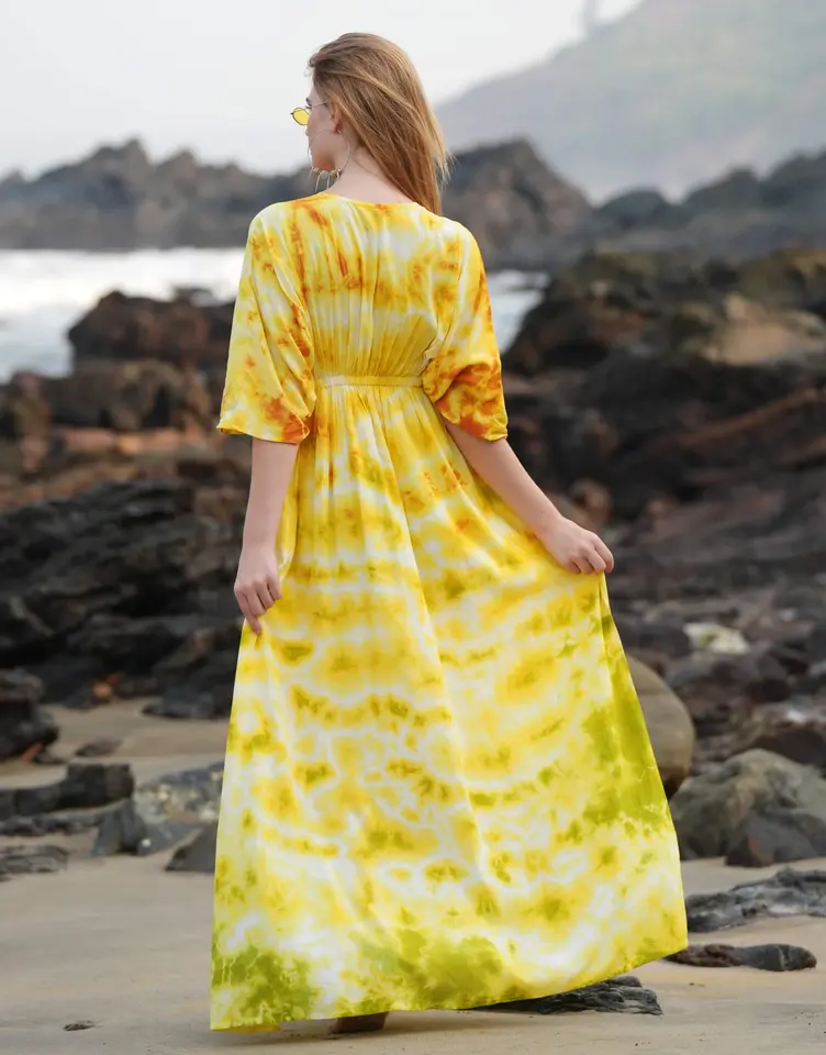 Indien fait à la main luxe Tie Dye été couleur vive femmes portent rayonne haute jambe Spaghetti à manches courtes col en V coupe longue caftan robe