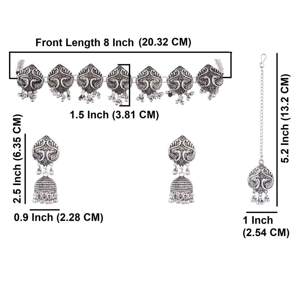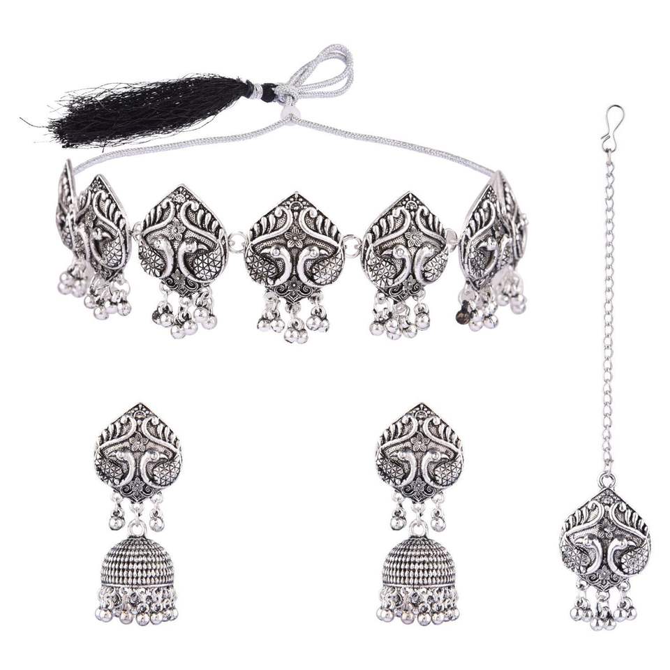 Ensemble de bijoux indiens Collier oxydé Collier de paon Boucles d'oreilles indiennes traditionnelles Jhumka avec Maang Tikka Set, Argent