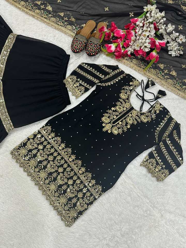 Designer indien pakistanais Readymade vêtements ethniques ensemble 3 pièces Sharara Gharara Kurti cousu Design brodé Georgette tissu