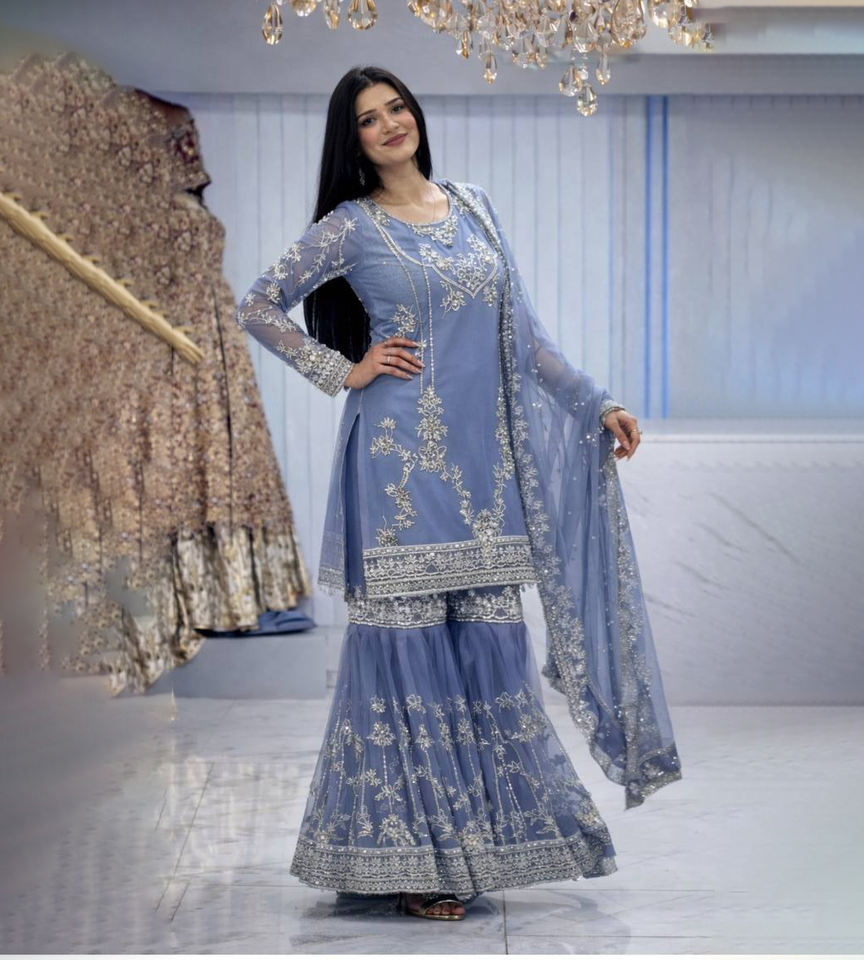 Robe ethnique moderne indienne et pakistanaise en tissu faux georgette lourd, ensemble sharara et palazzo de créateur avec dupatta, prêt-à-porter
