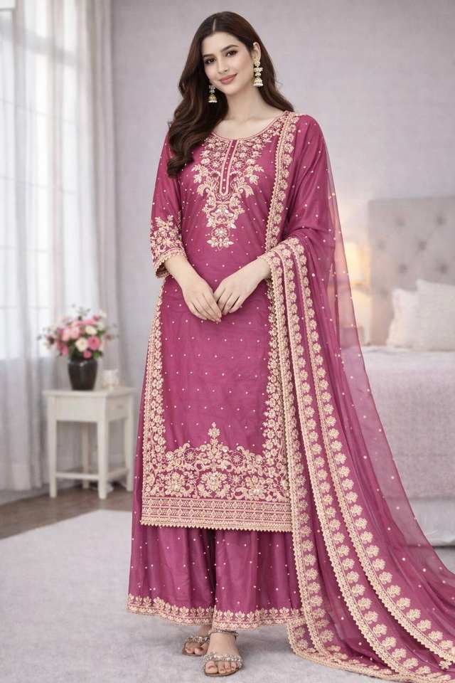 Indian Pakistani Style Heavy Embroidery Codding Work Chinon Sharara Suit Salwar Kameez Loose Fit Knee-Length Reversible Winter
