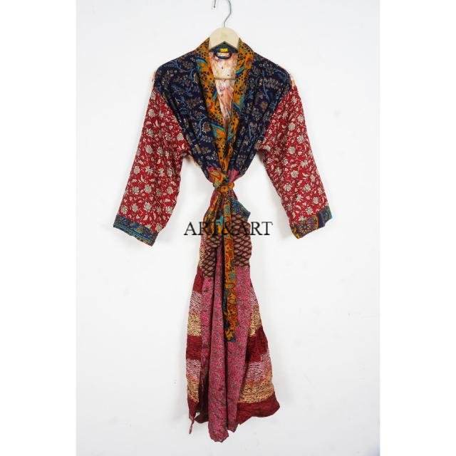 Indian Silk Elegant Boho Floral Patchwork Long Beach Cover-Up Summer Cardigan Women's Night Wear Sleepwear Robe Soft Breathable