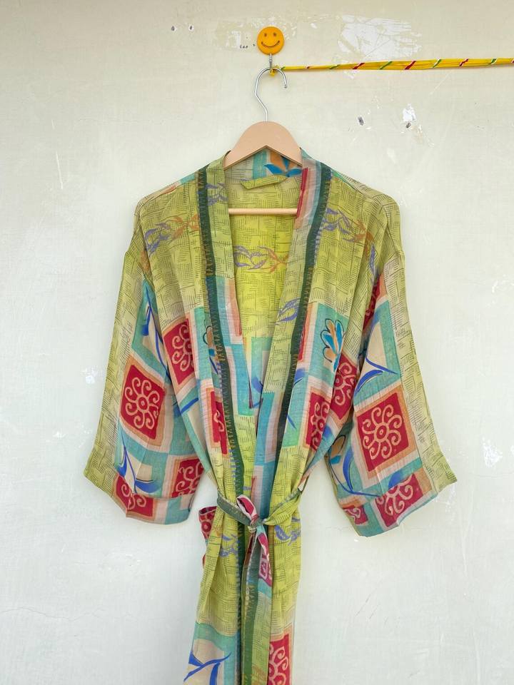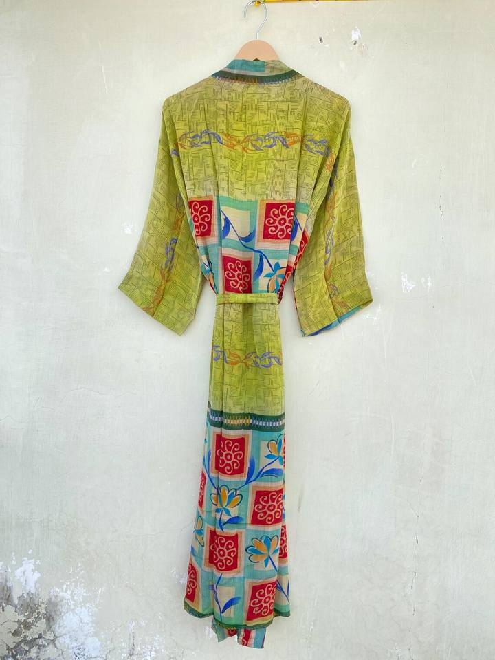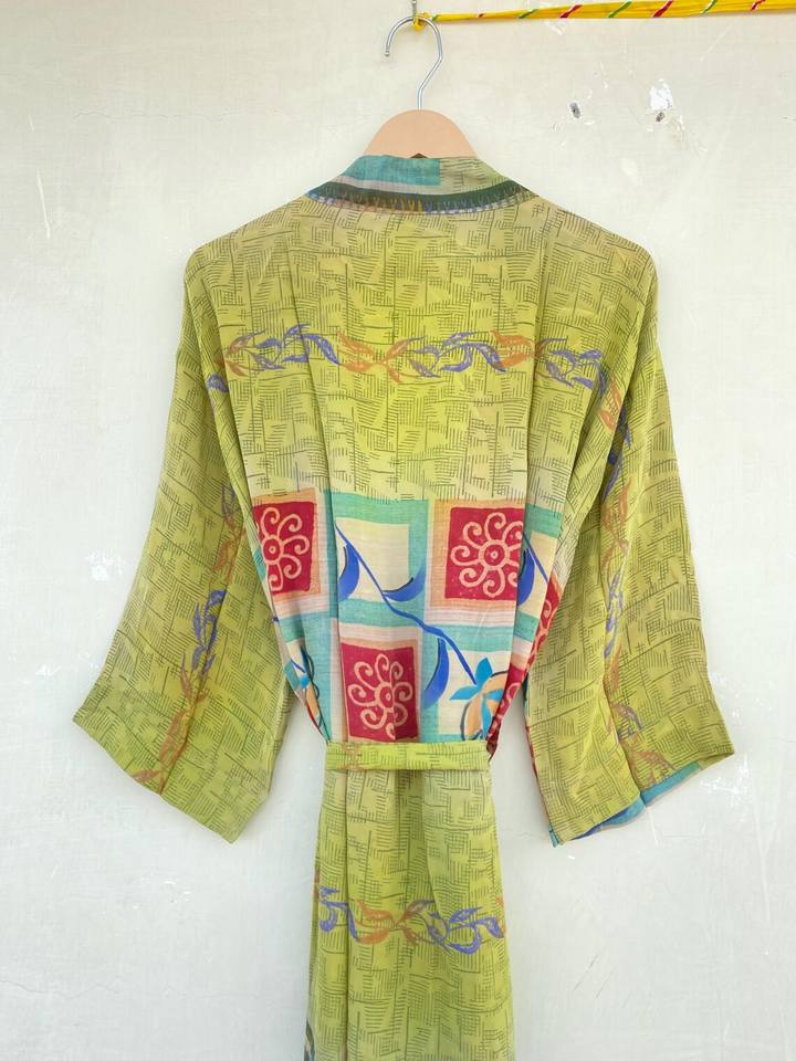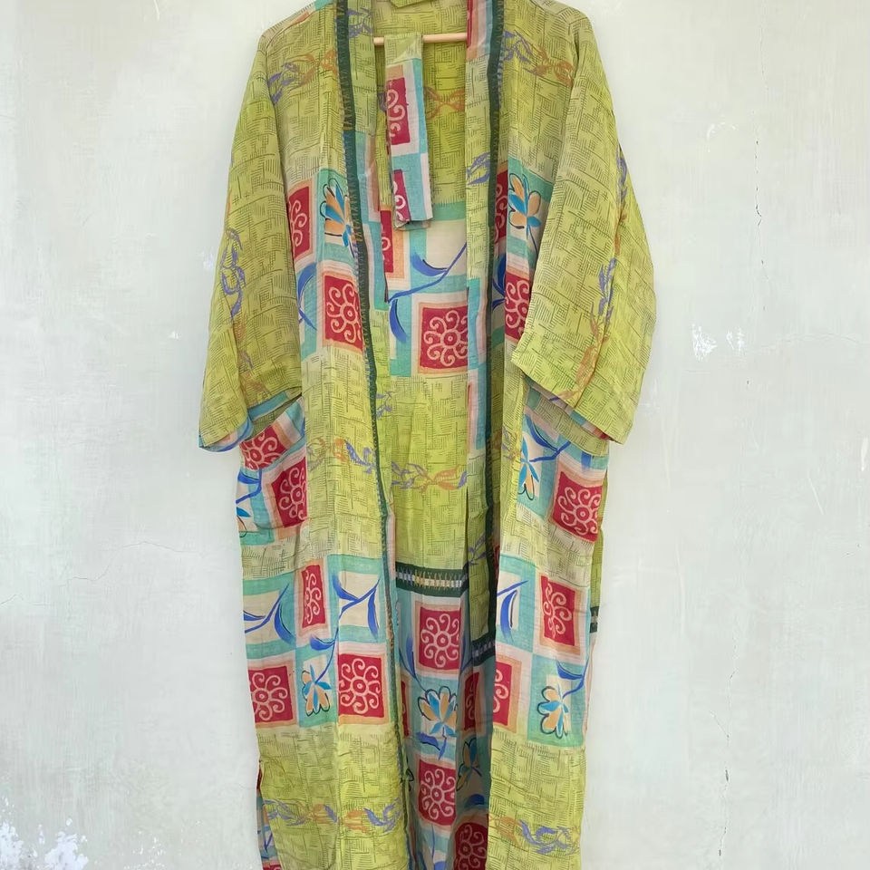 Indian Silk Kimono Robe Vintage Women's V-neck Three Quarter Sleeve Full Length with Belt Breathable Summer Autumn Spring