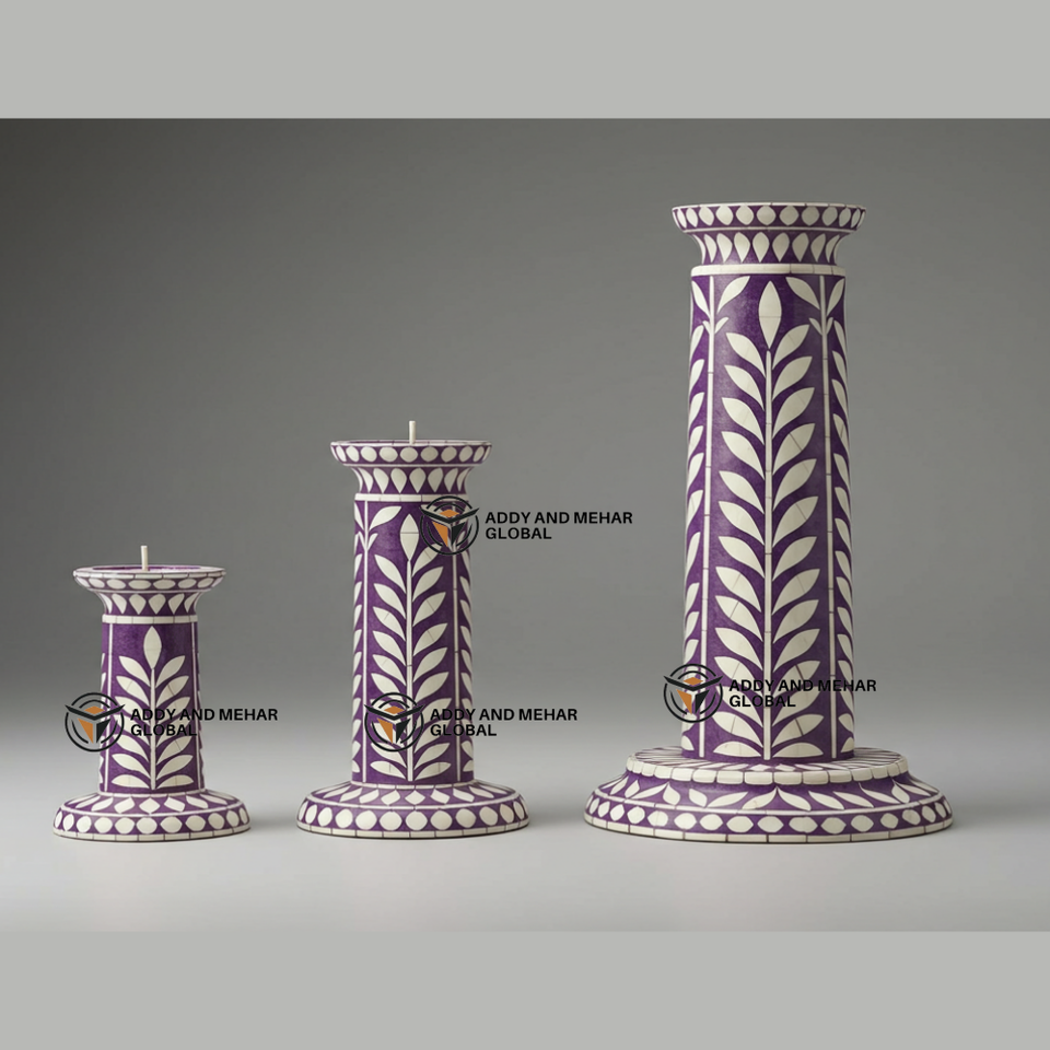 Indian Supplier Offers Handmade Purple Bone Inlay Candle Holder Set Floral Pattern Decorative Candlestick