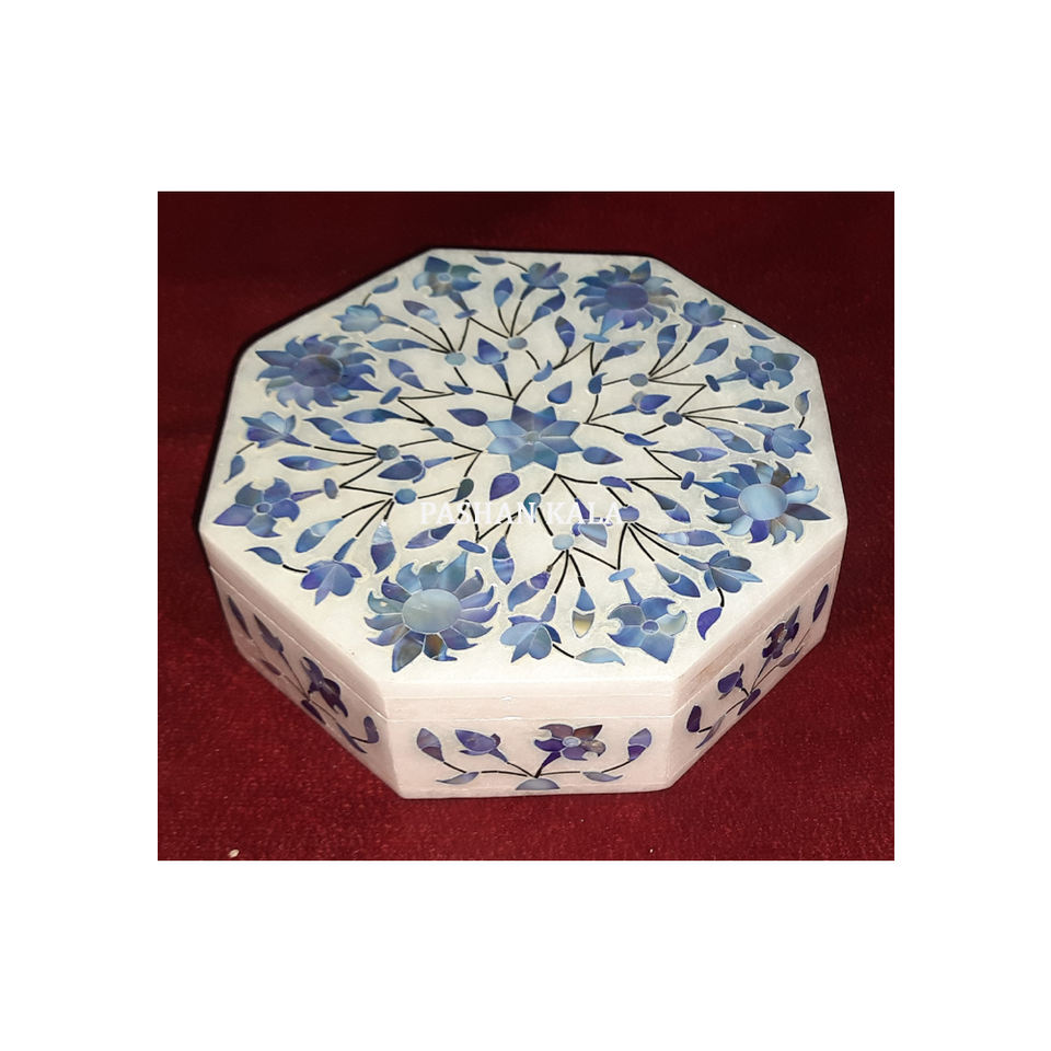 Magnifique produit d'incrustation indien de haut niveau avec coquillage bleu naturel Prix le plus bas Marbre blanc Incrustation de nacre Boîte à bijoux