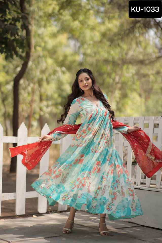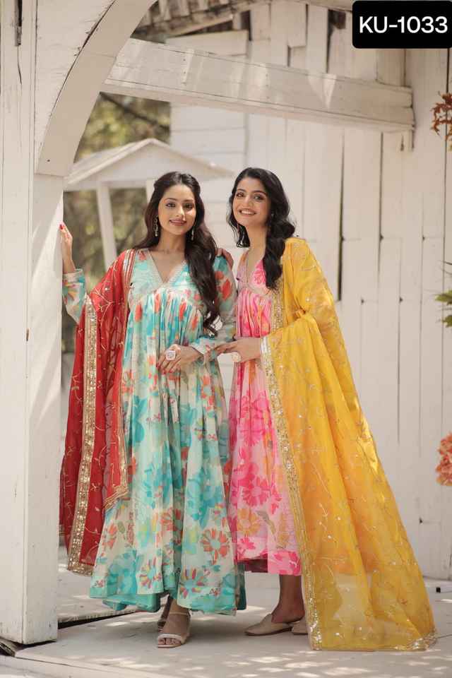 Vêtements traditionnels indiens Robes de fantaisie en soie russes imprimées numériquement avec travail brodé avec bordure en dentelle de créateur