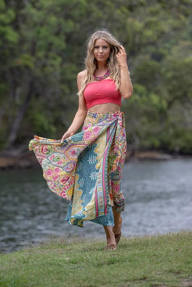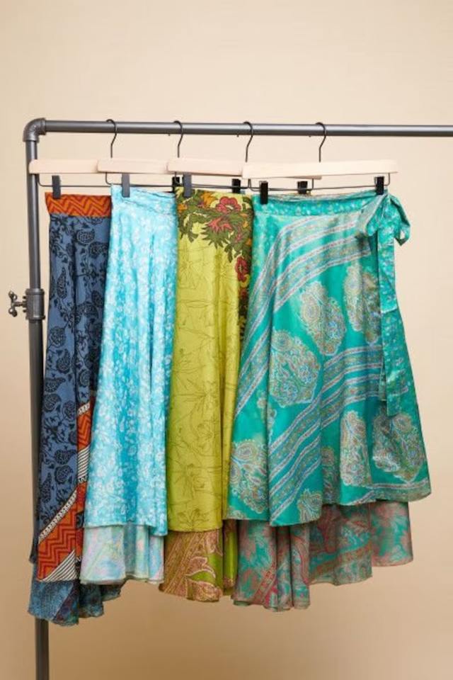 Jupe en soie indienne vintage double couche 36 "longue jupe hippie gitane enveloppante magique à la main jupe portefeuille taille libre femmes cravate Maxi
