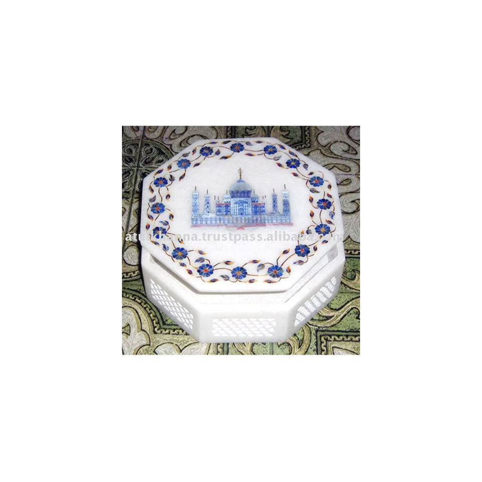 Incrustation et sculpture en marbre blanc indien avec boîte à bijoux de travail de conception de Taj Mahal pour les cadeaux d'entreprise au prix le plus bas
