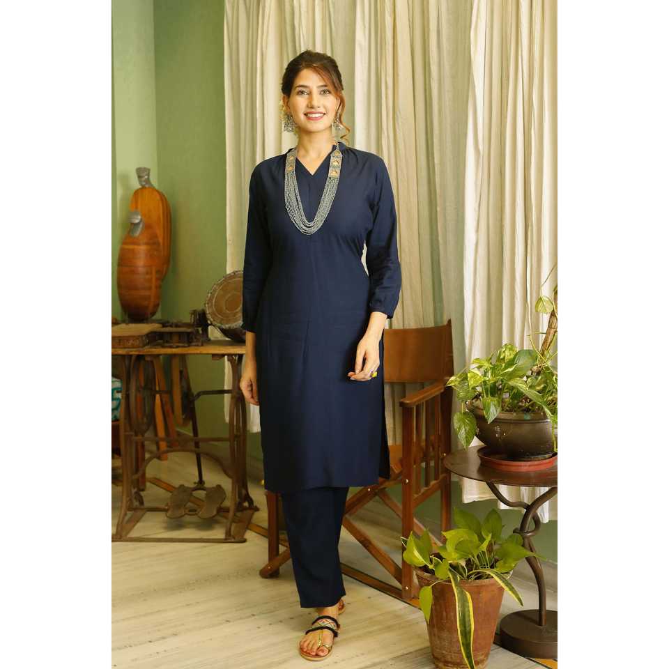 Ensemble Kurta en crêpe bleu indigo respirant pour femmes, taille XS, avec manches trois-quarts
