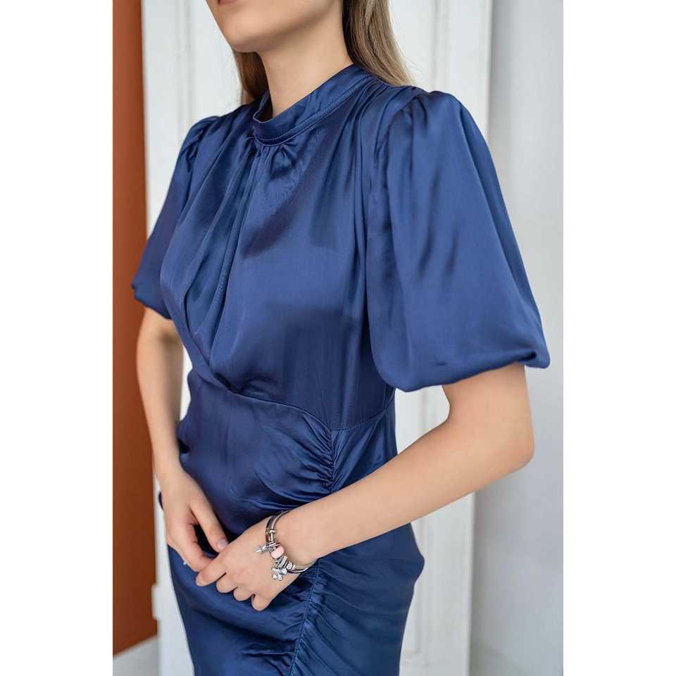 Robe fourreau en satin indigo froncé à col montant et taille naturelle, confortable pour les soirées