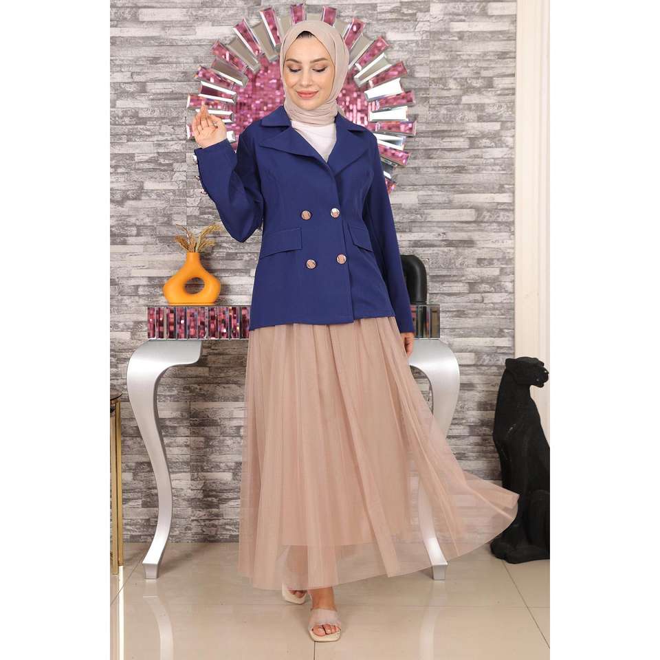 Ensemble en tulle indigo MSW19151-1 – Blazer décontracté en coton et jupe midi, taille XS-XL, motif uni tissé, coupe ajustée pour le printemps