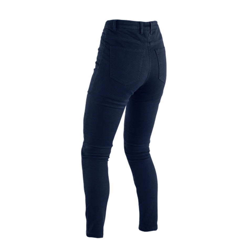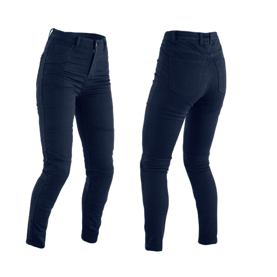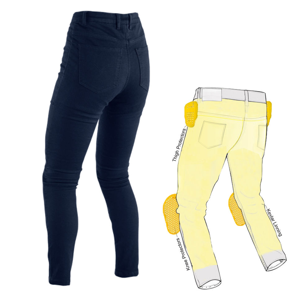 Indigo blue denim biker jeans with Kevlar reinforcement and CE-approved protection for motorcycle safety