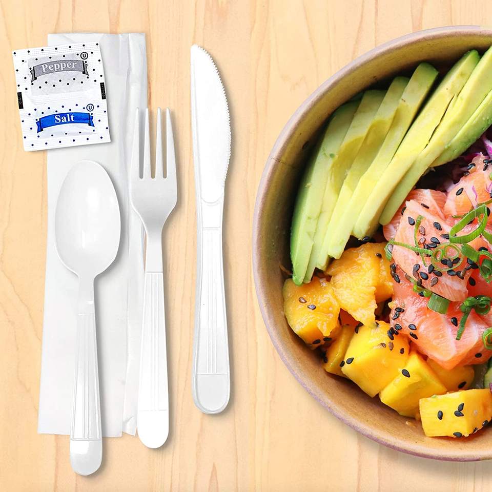 Ensemble de couverts jetables en plastique blanc, emballage individuel/non emballé, couteau fourchette cuillère serviette sel poivre