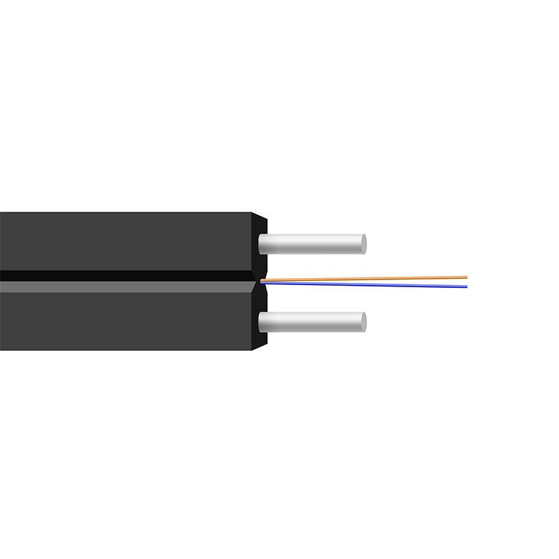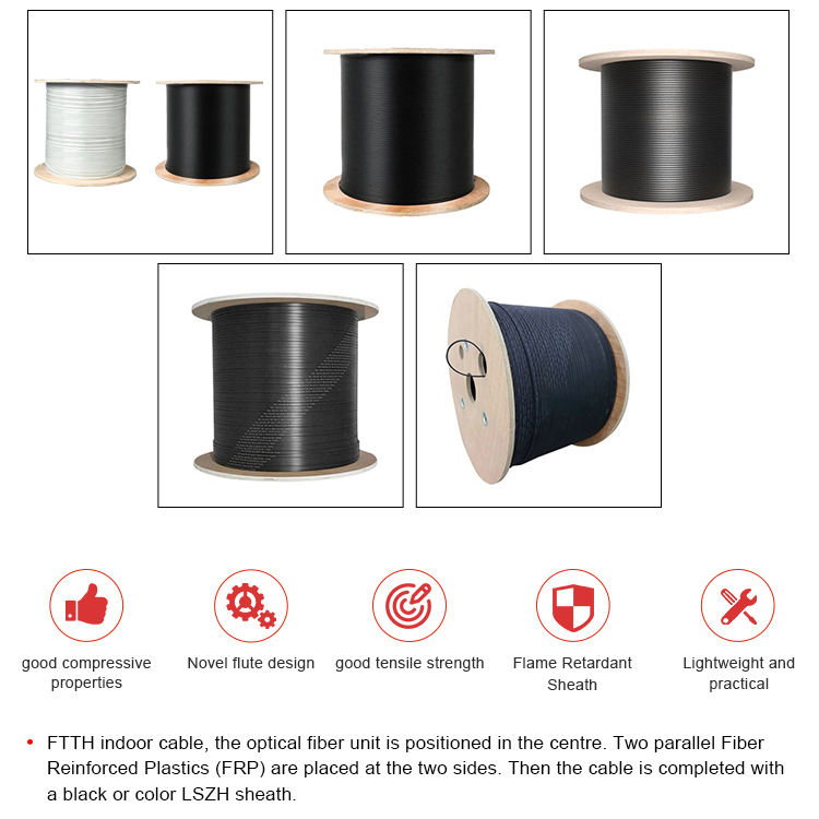 Câble de branchement FTTH plat intérieur 12 fibres G652D/G657A1 Fibre optique avec renfort FRP ou acier POE RJ45 GSM