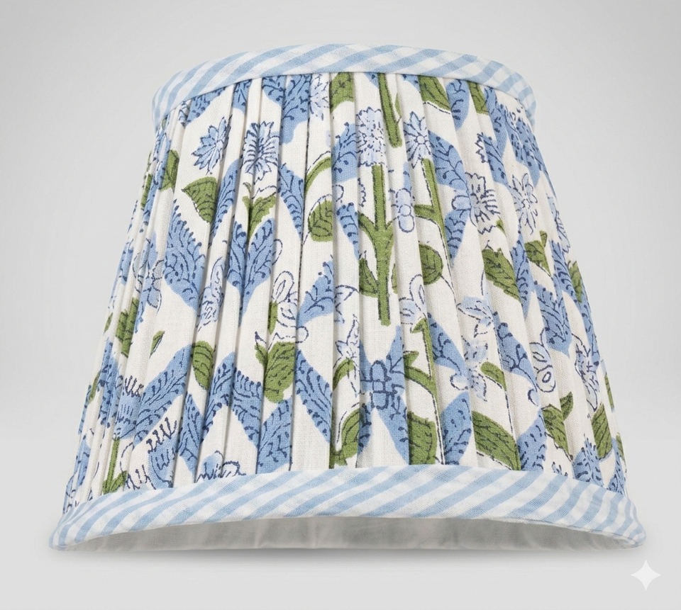 Abat-jour plissé imprimé à la main pour éclairage décoratif intérieur, motif floral bleu côtier, moyen, 4 po (haut) x 6 po (bas) x 5 po (profondeur)