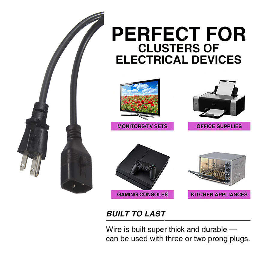 Rallonge d'appareil intérieur et extérieur résistante au froid de 6 pieds NEMA 5-15P IEC C14 10A 16AWG SJT pour ordinateurs de couleur noire