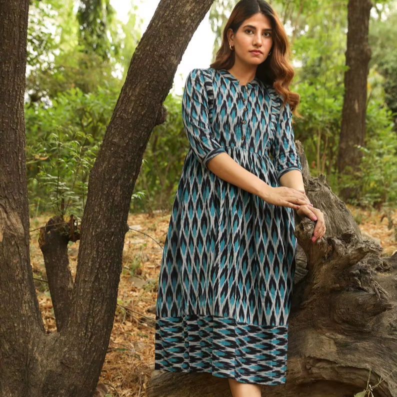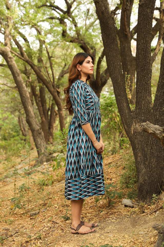 Indrani Bohemian Dress Pure Cotton Handloom Ikat Casual Occasional Holiday Summer Blue White