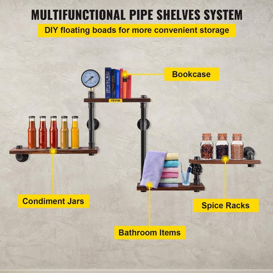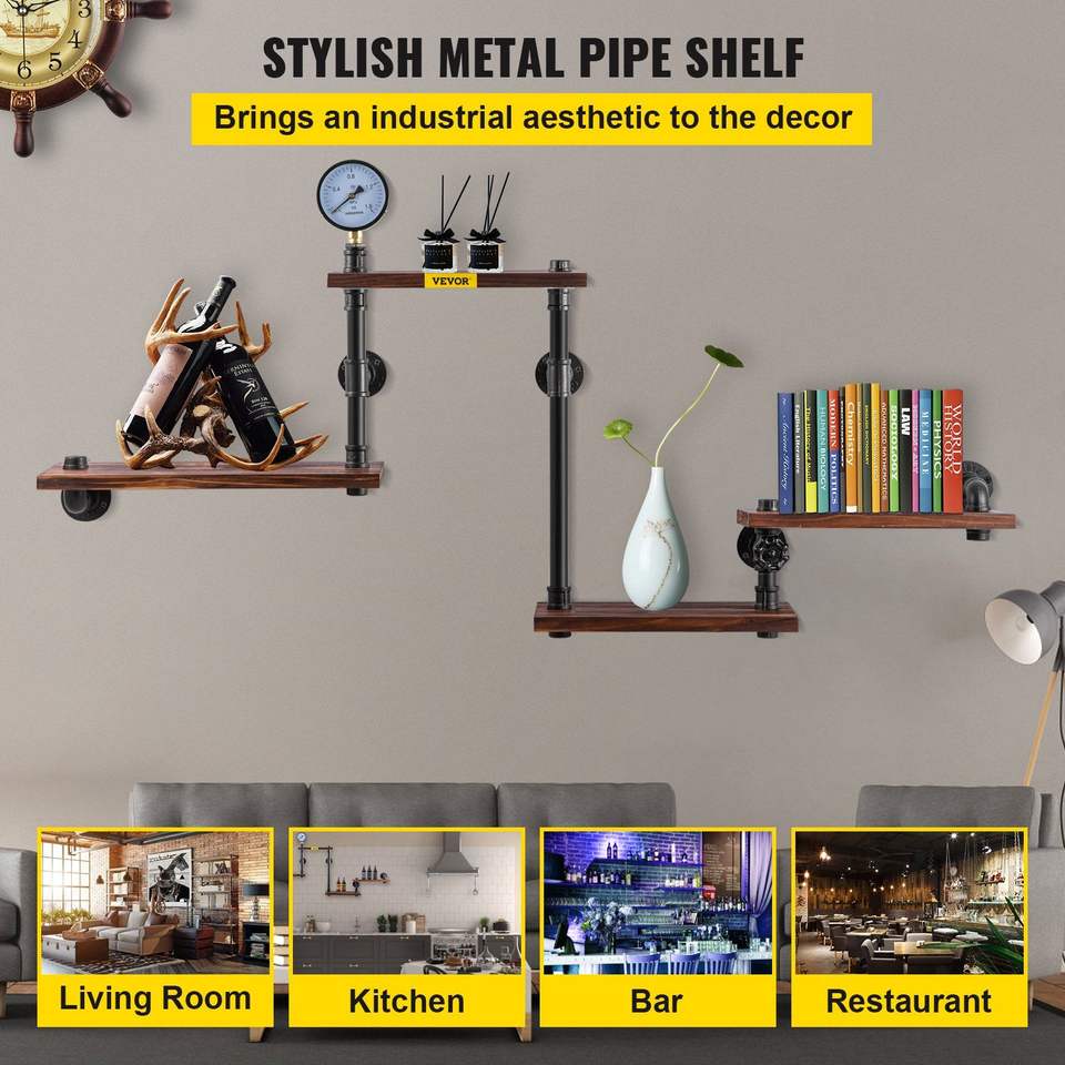 Étagères murales industrielles rustiques à 4 niveaux en bois flottant et tuyaux, bibliothèque murale DIY