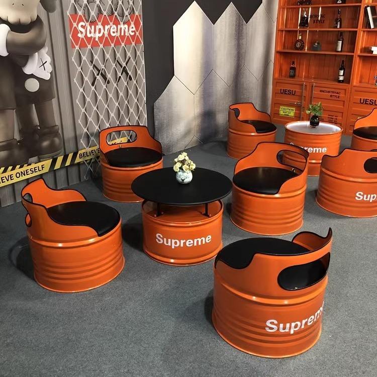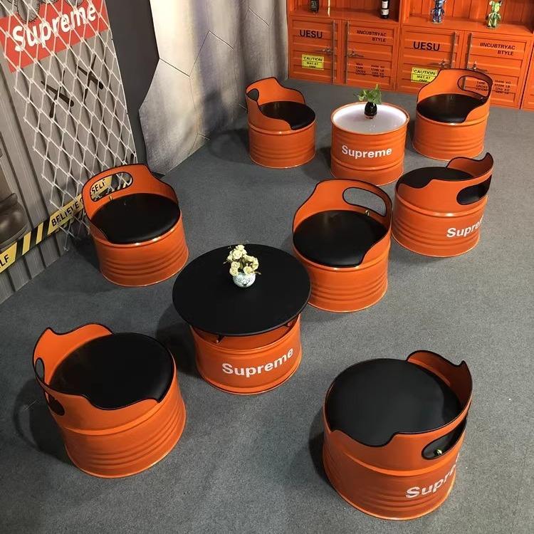 Ensemble de banquettes industrielles en forme de baril, 1 table basse en métal avec sièges de style tambour pour café, bar et salon de bureau