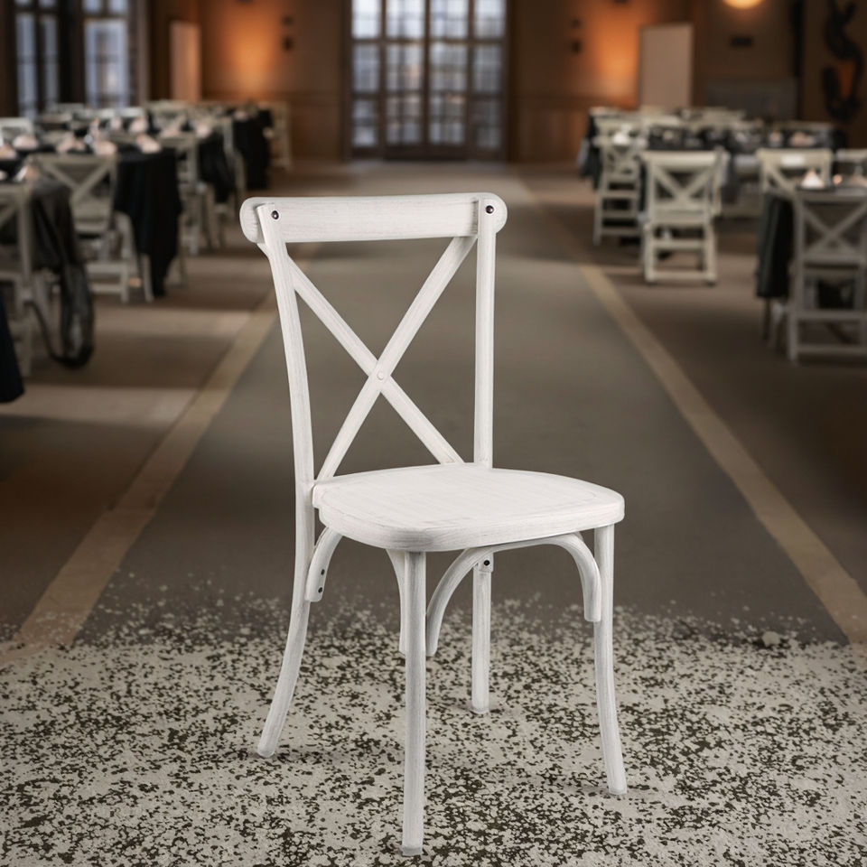 Chaises industrielles élégance rustique léger et durable en résine Crossback Lime Wash pour les mariages vintage célébrations de jardin en plein air