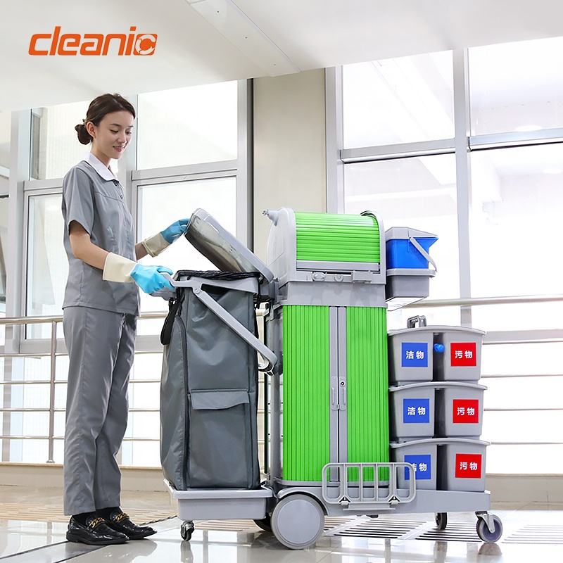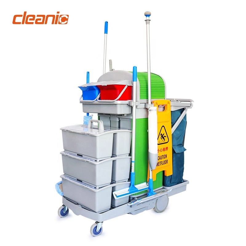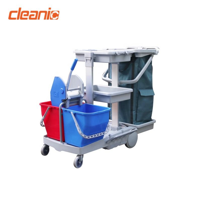Chariot de nettoyage industriel avec double seau, serpillière sèche et humide, essoreuse à pression et sac poubelle en nylon pour hôpital