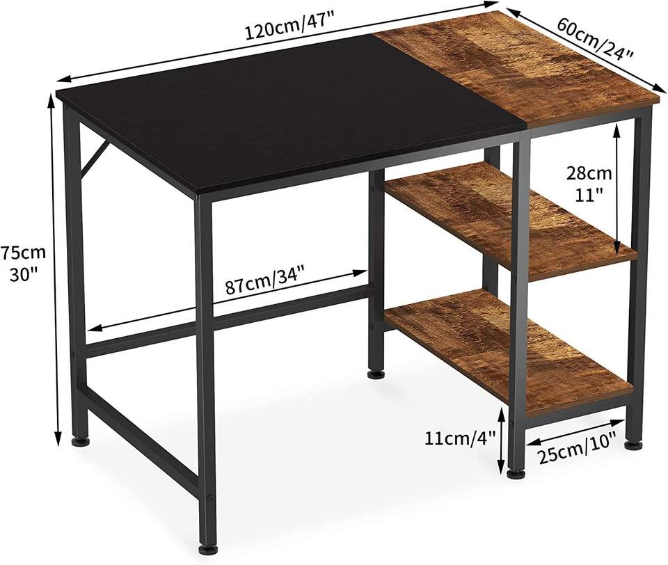 Bureau d'ordinateur industriel avec 2 étagères de rangement, bureau d'écriture rustique, poste de travail pour la maison, le bureau, la chambre à coucher, l'étude