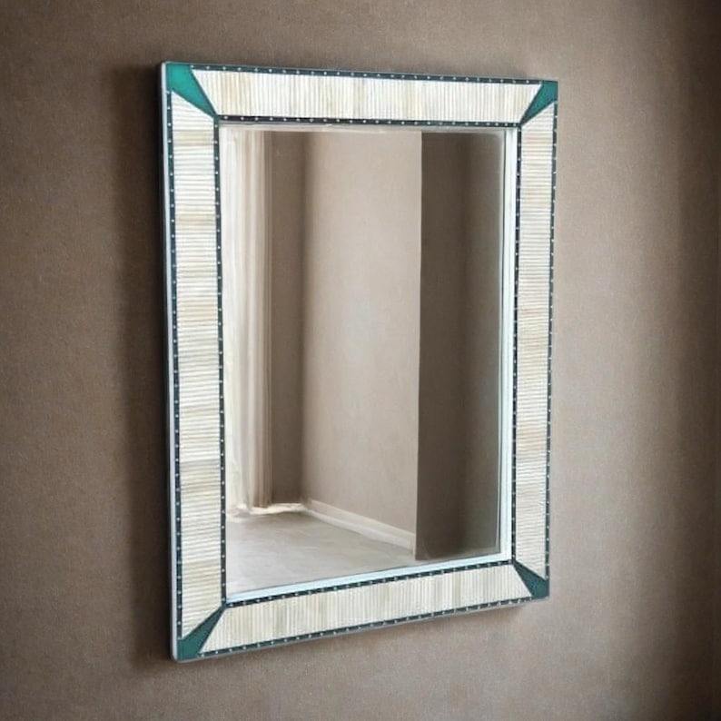 Miroir mural en verre avec cadre en os coloré fantaisie - Fabriqué à la main, respectueux de l'environnement, à prix raisonnable