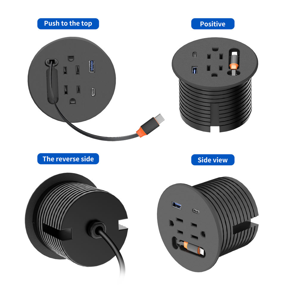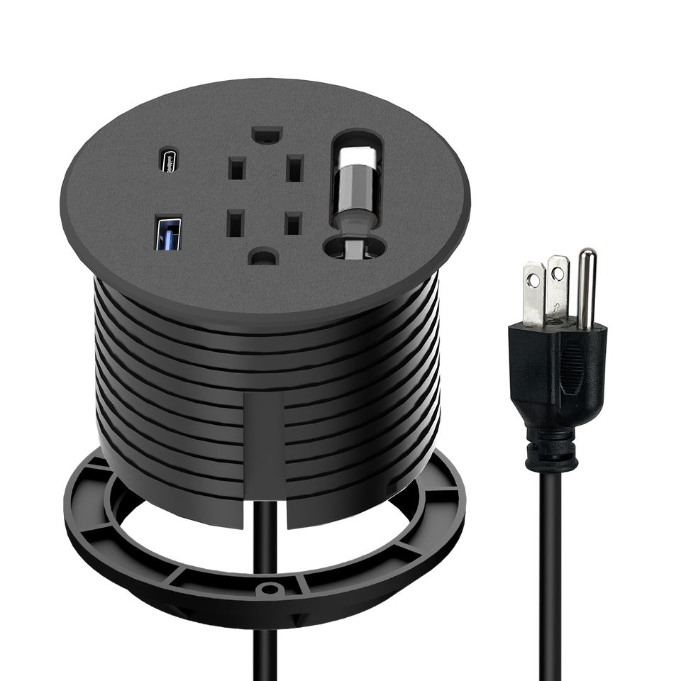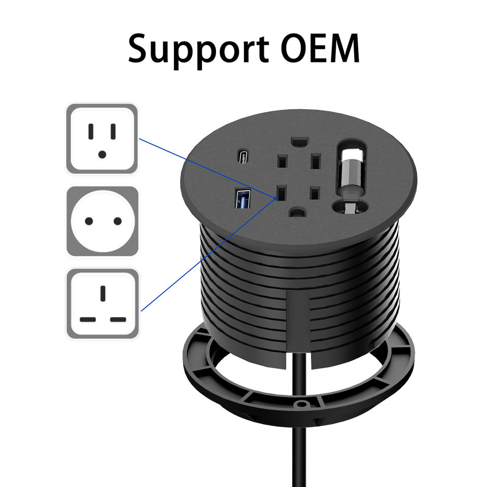 Multiprise de bureau encastrable pour mobilier industriel avec câble d'extension rétractable USB-C PD20W, prise UK/US/EU, pour trou de 3 pouces, charge rapide