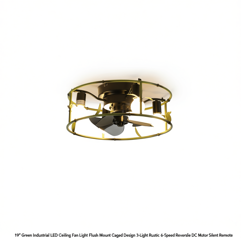 Ventilateur de plafond LED industriel 19 pouces, design en cage, 3 lumières, moteur DC rustique, télécommande