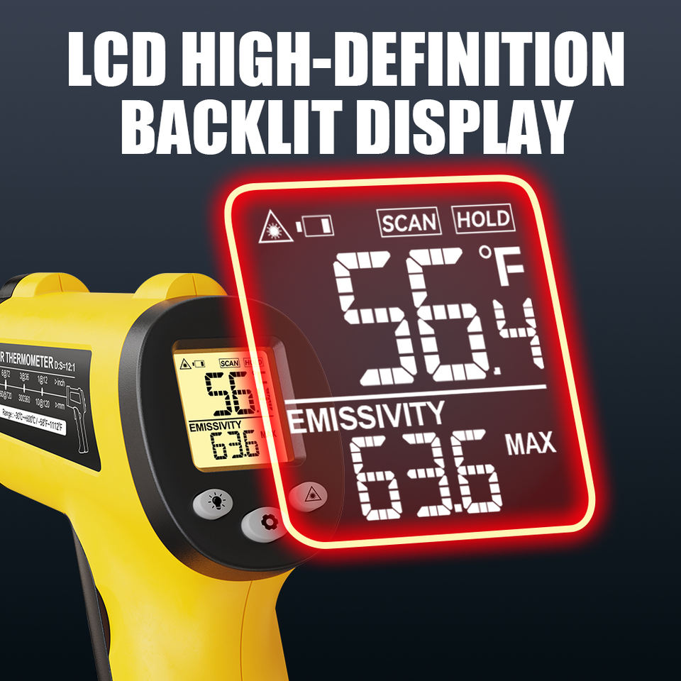 Thermomètre infrarouge industriel OEM sans contact, ciblage laser, mesure à un bouton, écran LCD lisible en faible luminosité, plastique, IP55, large portée