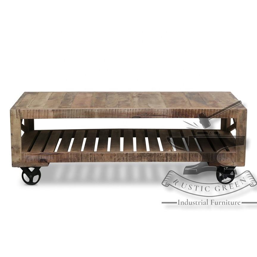 Product Name:Industrial Raw Wood Finish Coffee Table With Wheels